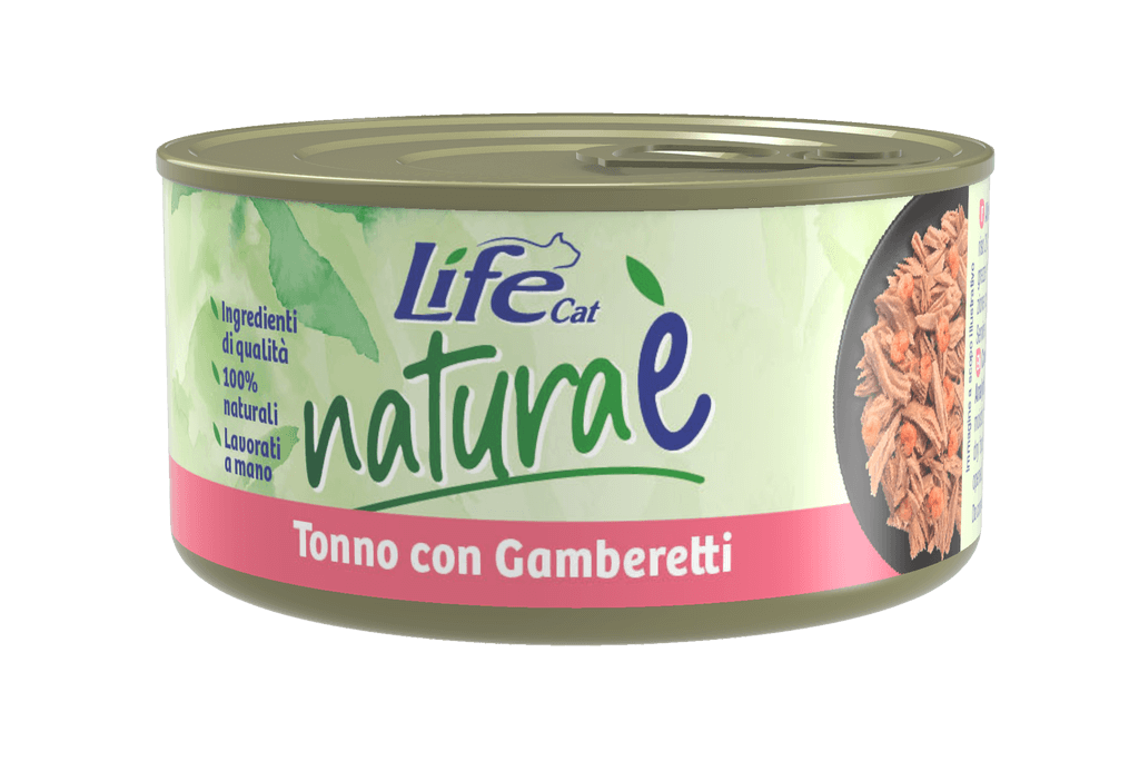 | Life cat Natura è tonno è un alimento completamente naturale, fatto con tonno di prima scelta, con l’aggiunta di gamberetti, in acqua di cottura. Senza coloranti e conservanti, permette di alimentare il tuo gatto in modo genuino e gustoso. |