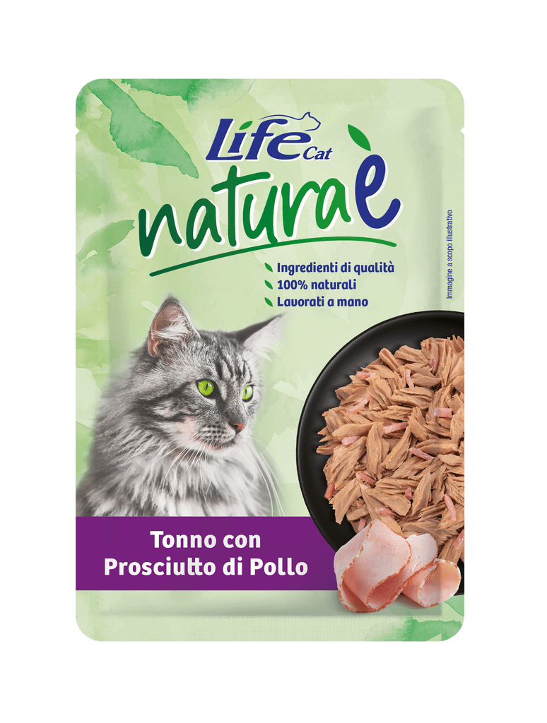 | Life cat Natura è tonno con prosciutto di pollo è un alimento completamente naturale, fatto con tonno di prima scelta e prosciutto di pollo in morbida gelatina. Senza coloranti e conservanti, permette di alimentare il tuo gatto in modo genuino e gustoso. |