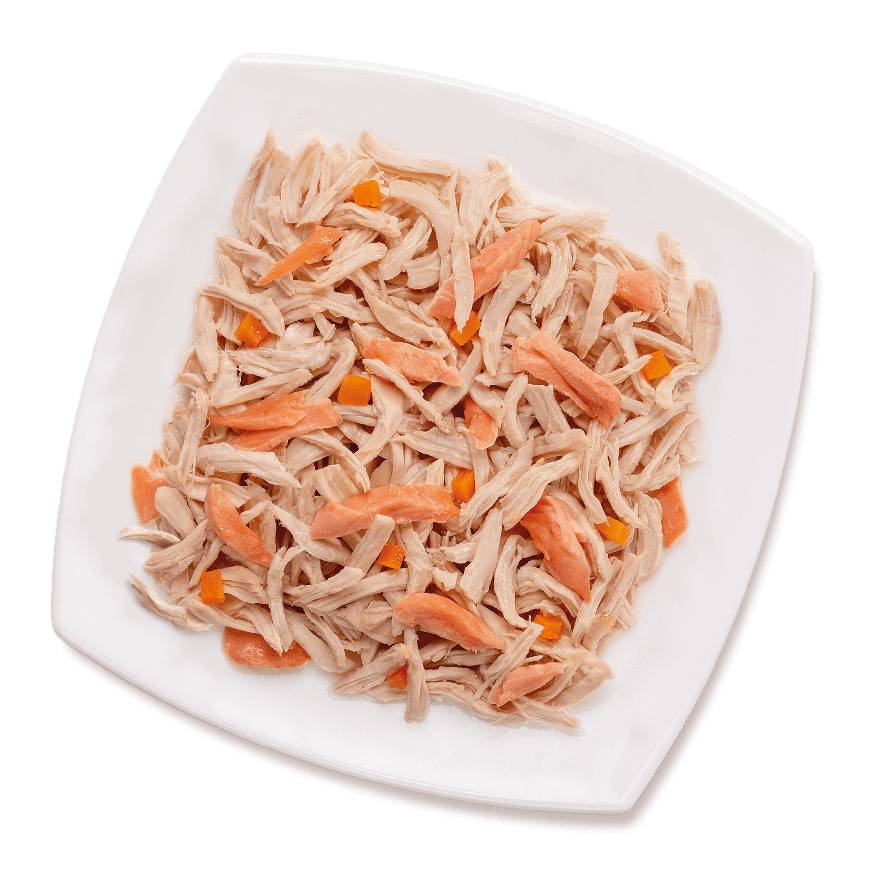 Filetti di vero petto di pollo presenti in grande quantità con aggiunta di salmone e carote. Il tutto cotto al vapore e conservati in gelatina vegetale. Senza coloranti, conservanti o additivi.