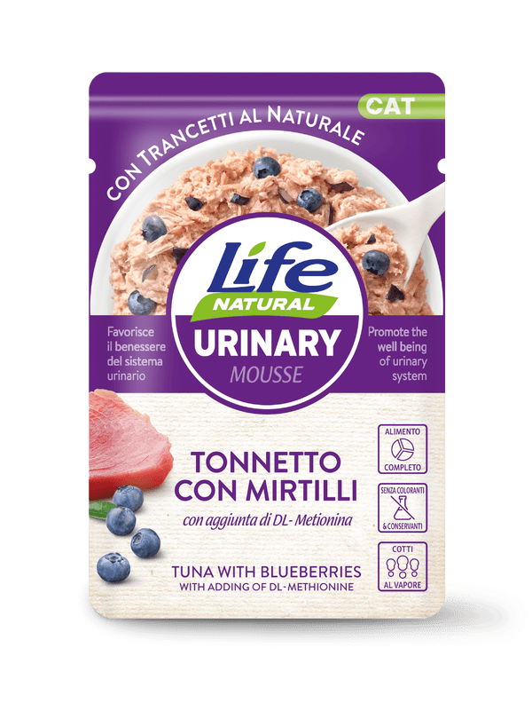 Life Natural Urinary Mousse è un alimento completo per gatti adulti, fatto con trancetti di tonnetto al naturale e un’aggiunta di mirtilli, importante fonte di antiossidanti naturali. Grazie all’integrazione di DL – metionina, si promuove il mantenimento di un valore ottimale del PH nelle urine del gatto. Il tutto per favorire il benessere del suo sistem urinario.