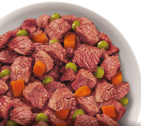 “Polpa di manzo tagliata a bocconcini con verdure. La carne di manzo è ricca di proteine di elevato valore biologico, con pochi grassi e carboidrati, ed è ricca di minerali e di vitamine. Le verdure apportano fibre e vitamine.”